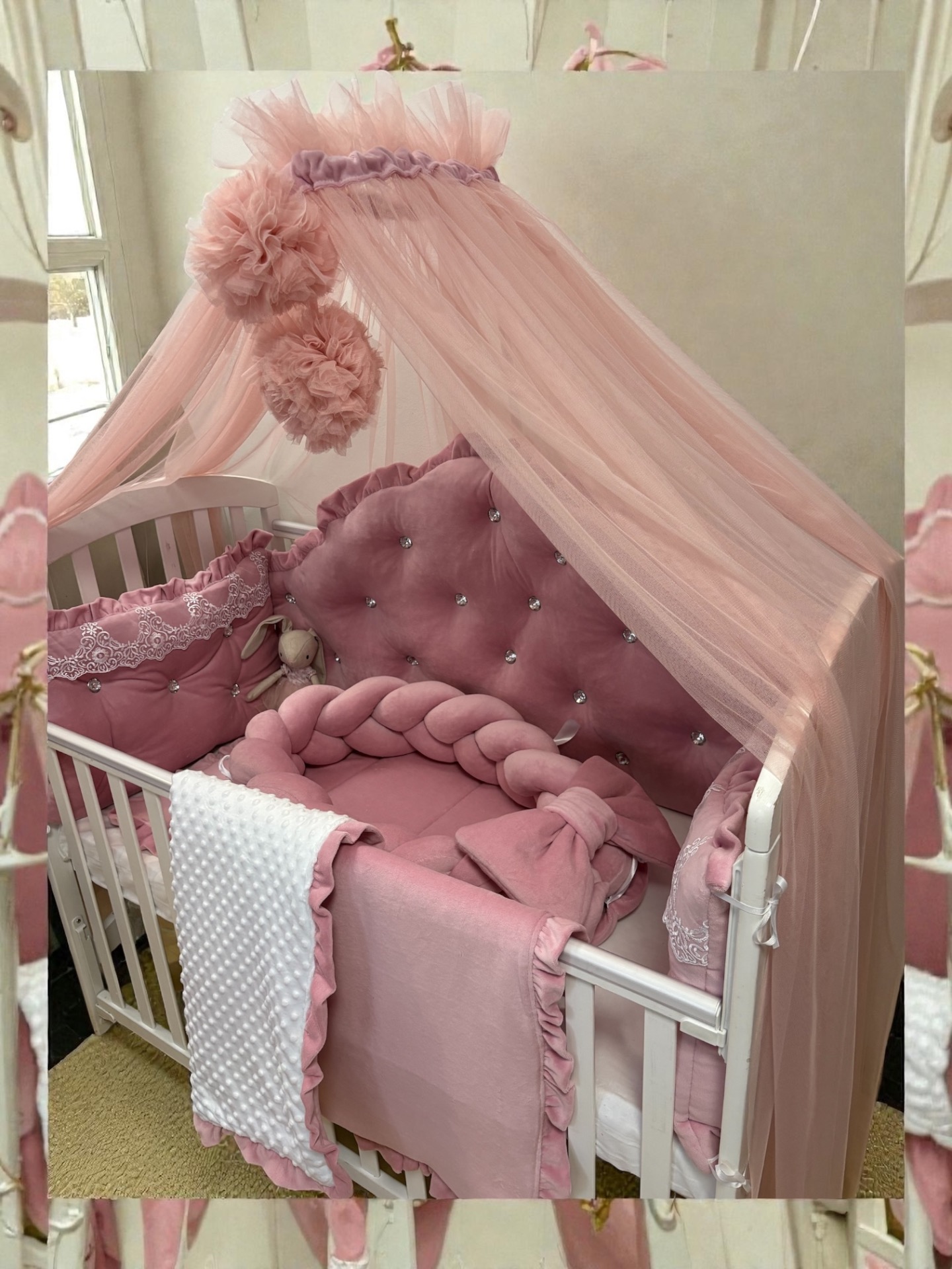 Igazán elegáns mégis letisztult szett pompomos tüll baldachinnel és fonott babafészekkel.Magasított strasszköves rácsvédővel.