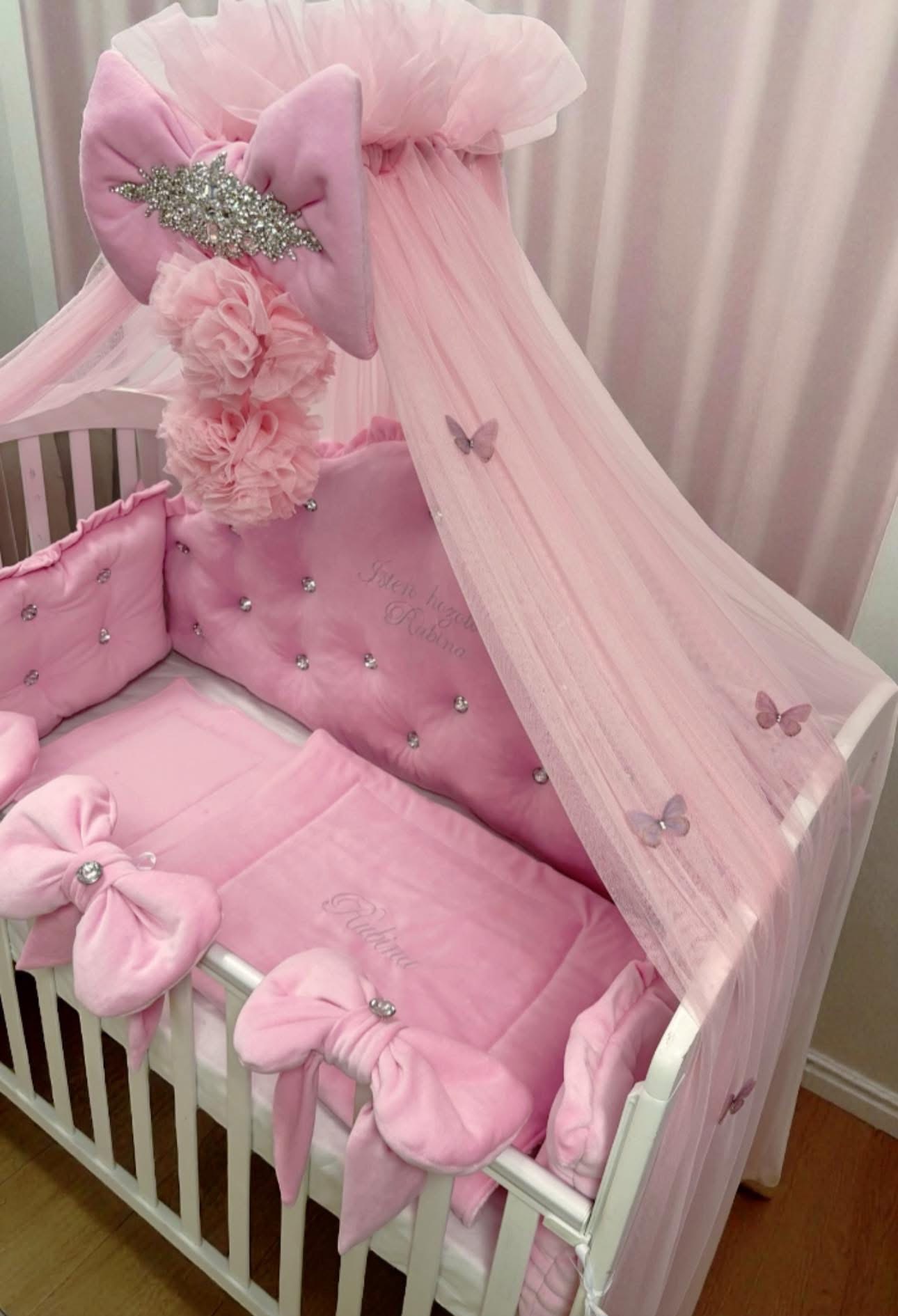 A legújabb trend most a pomponos baldachin ,teljesen feldobja a kiságy hangulatát.Extra ezen a szetten a repkedő pillangók és az óriás strasszkő a masnin.