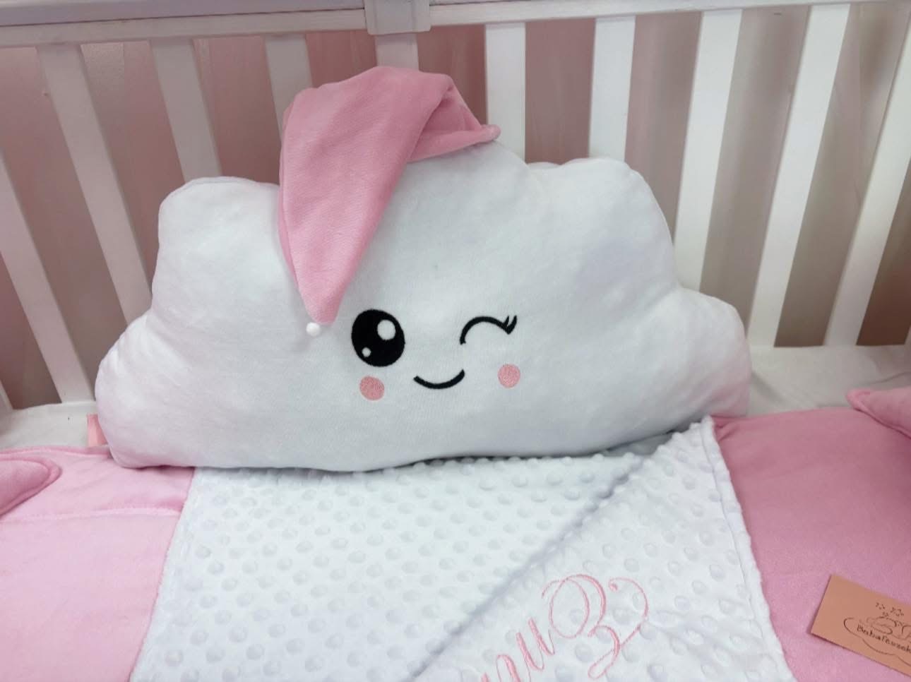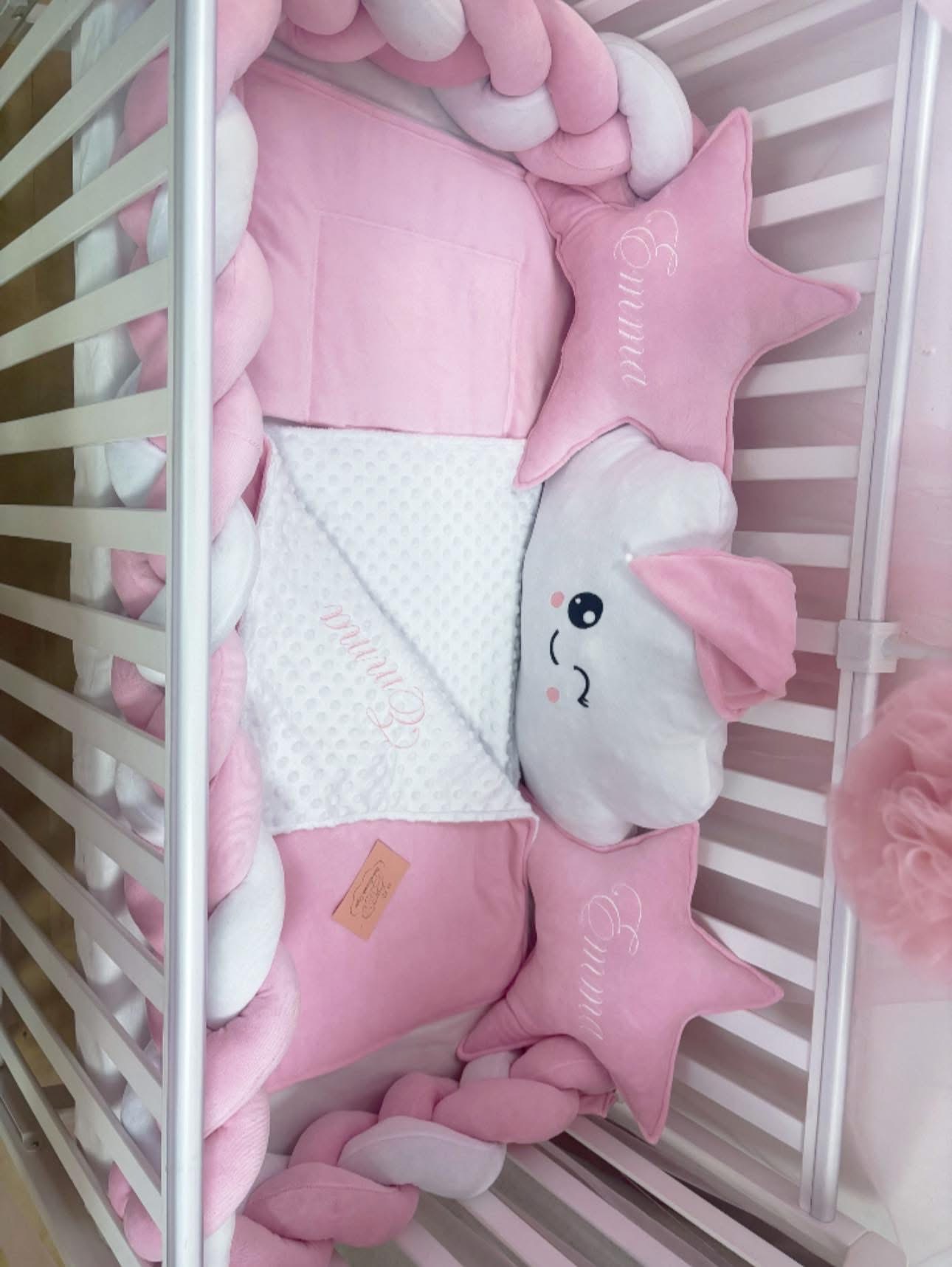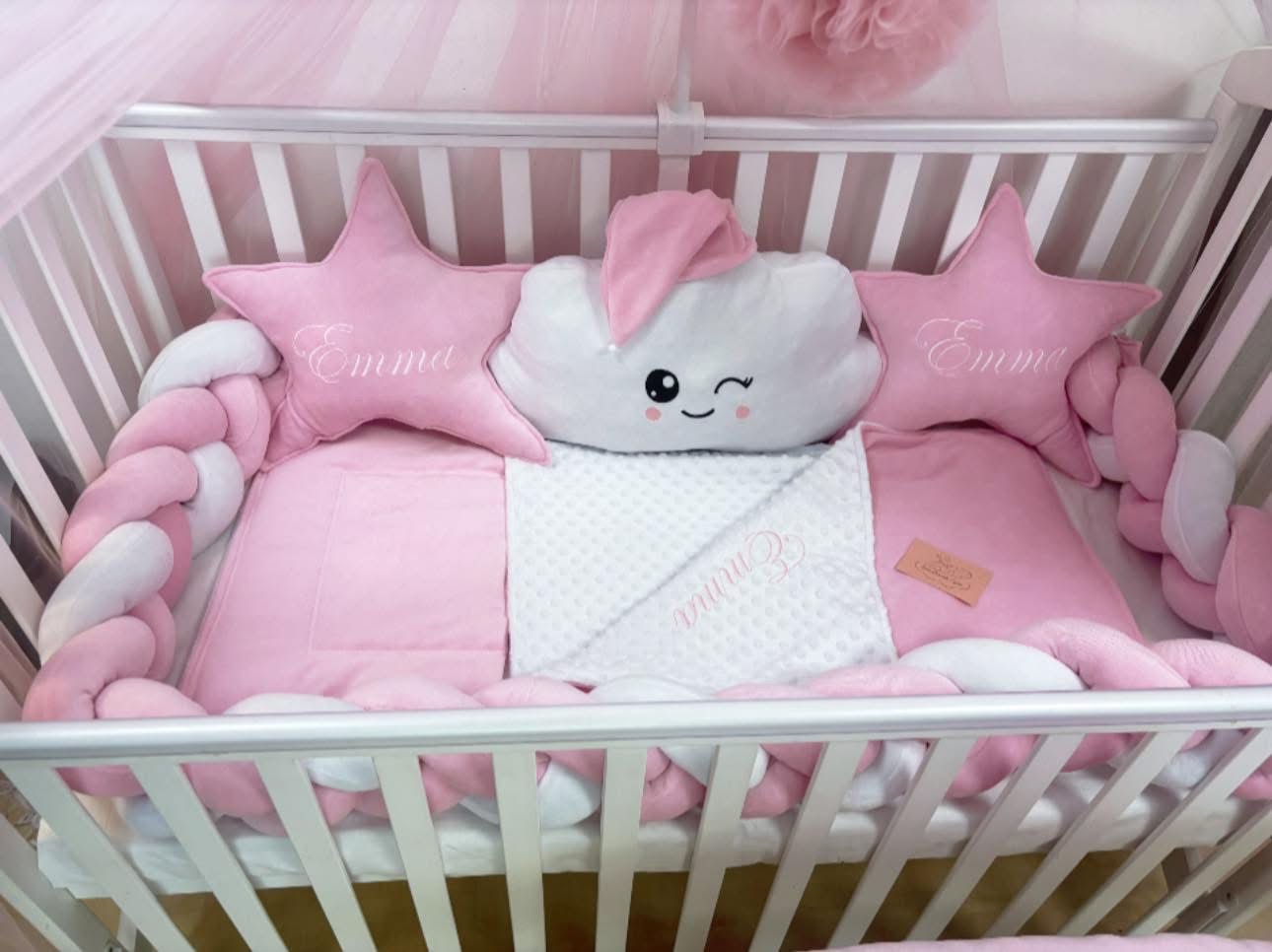 Rózsaszín kevelőinek egy igazán aranyos és biztonságos környezet a baba számára.Teljesen körbeérő egyedi rácsvédővel,pihe-puha plüss paplannal és babafészekkel készült elmaradhatatlan pompomos baldachinnel.Csillagpárnákban a baba nevével.Hímzett felhőcske arc,
